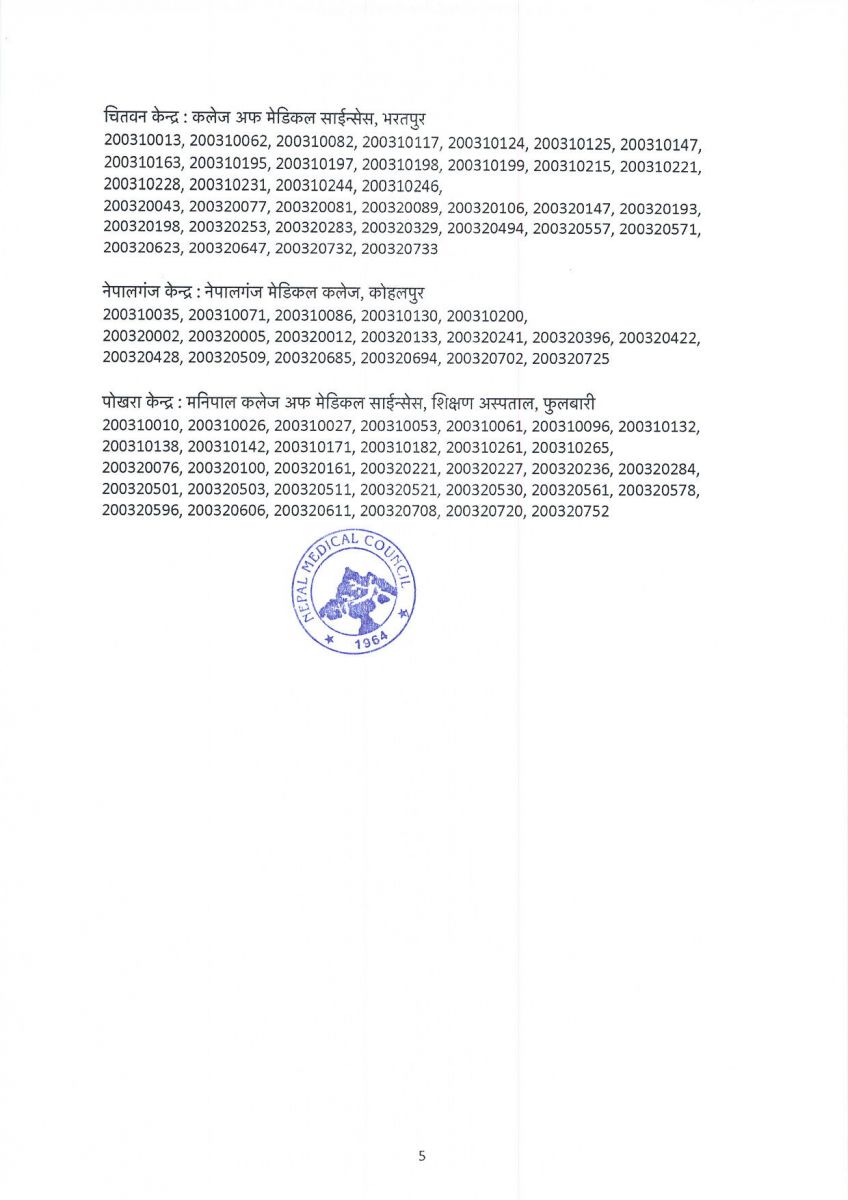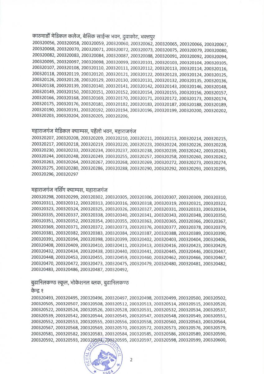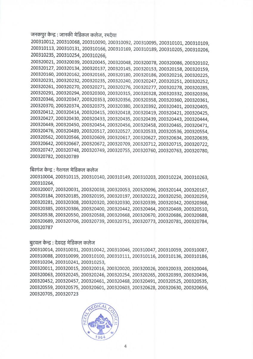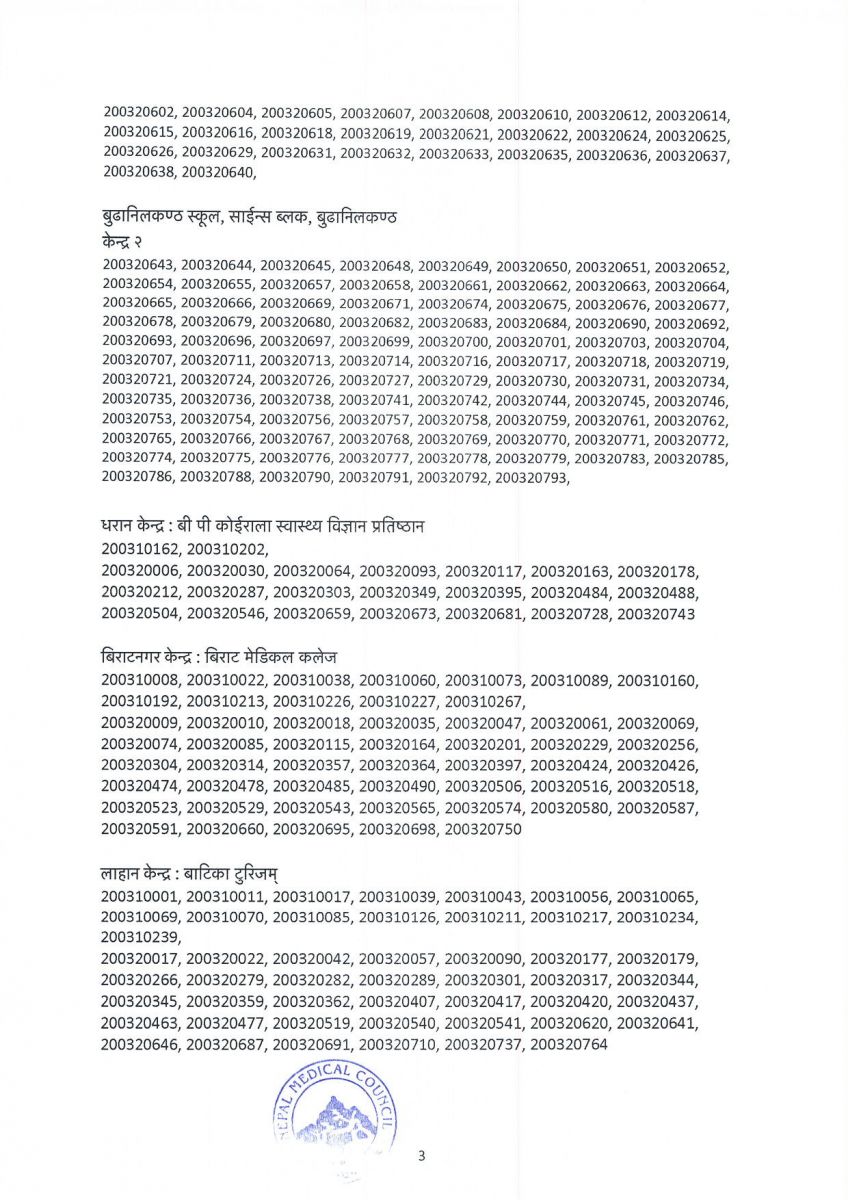 यसैगरी, बिपी कोइराला स्वास्थ्य विज्ञान प्रतिष्ठान धरान, विराट मेडिकल कलेज विराटनगर, लाहान प्राविधिक शिक्षालय लहान, जानकी मेडिकल कलेज जनकपुर, नेशनल मेडिकल कलेज वीरगञ्ज, देवदह मेडिकल कलेज बुटवल, कलेज अफ मेडिकल साइन्सेस भरतपुर, नेपालगञ्ज मेडिकल कलेज कोहलपुर र मणिपाल कलेज अफ मेडिकल साइन्सेस पोखरामा परीक्षा केन्द्र तोकिएको छ।