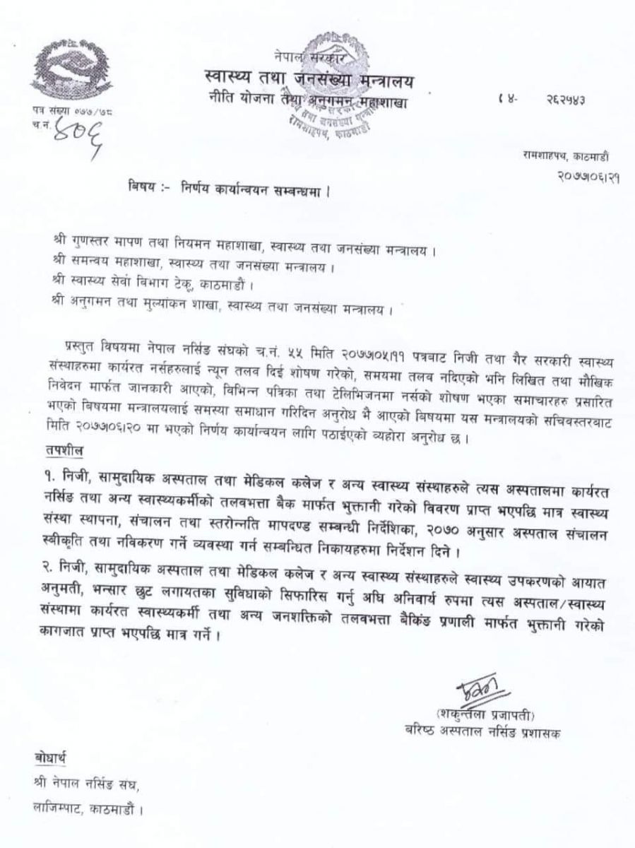 यसका साथै मन्त्रालयले निजी, सामुदायीक अस्पताल तथा मेडिकल कलेज र अन्य स्वास्थ्य स.स्थाहरुले स्वास्थ्य उपकरणको आयात अनुमती, भन्सार छुट लगायतका सिफारिस गर्नुअघि अनिवार्य रुपमा त्यस संस्थामा कार्यरत स्वास्थ्यकर्मी तथा जनशक्तिको तलबभत्ता बैंकिङ प्रणाली मार्फत भुक्तानी गरेको कागजपत्र बुझाएपछि मात्र पाउने भएका छन्।