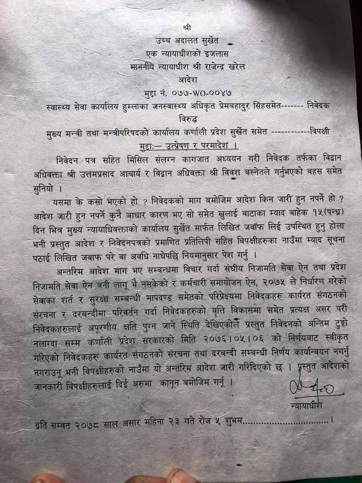 प्रदेश सरकारले पुरानो संरचना खारेज गर्दै छुट्टै नयाँ संरचना बनाएपछि स्वास्थ्य कार्यालय हुम्लाका जनस्वास्थ्य अधिकृत प्रेमबहादुर सिंहले उक्त निर्णयविरुद्ध उच्च अदालत सुर्खेतमा रिट दायर गरेका थिए। उक्त रिटको सुनुवाइ गर्दै न्यायाधीश खरेलको इजलासले तत्काल नयाँ संरचना र दरबन्दी कार्यान्वयन नगर्न आदेश दिएको हो।