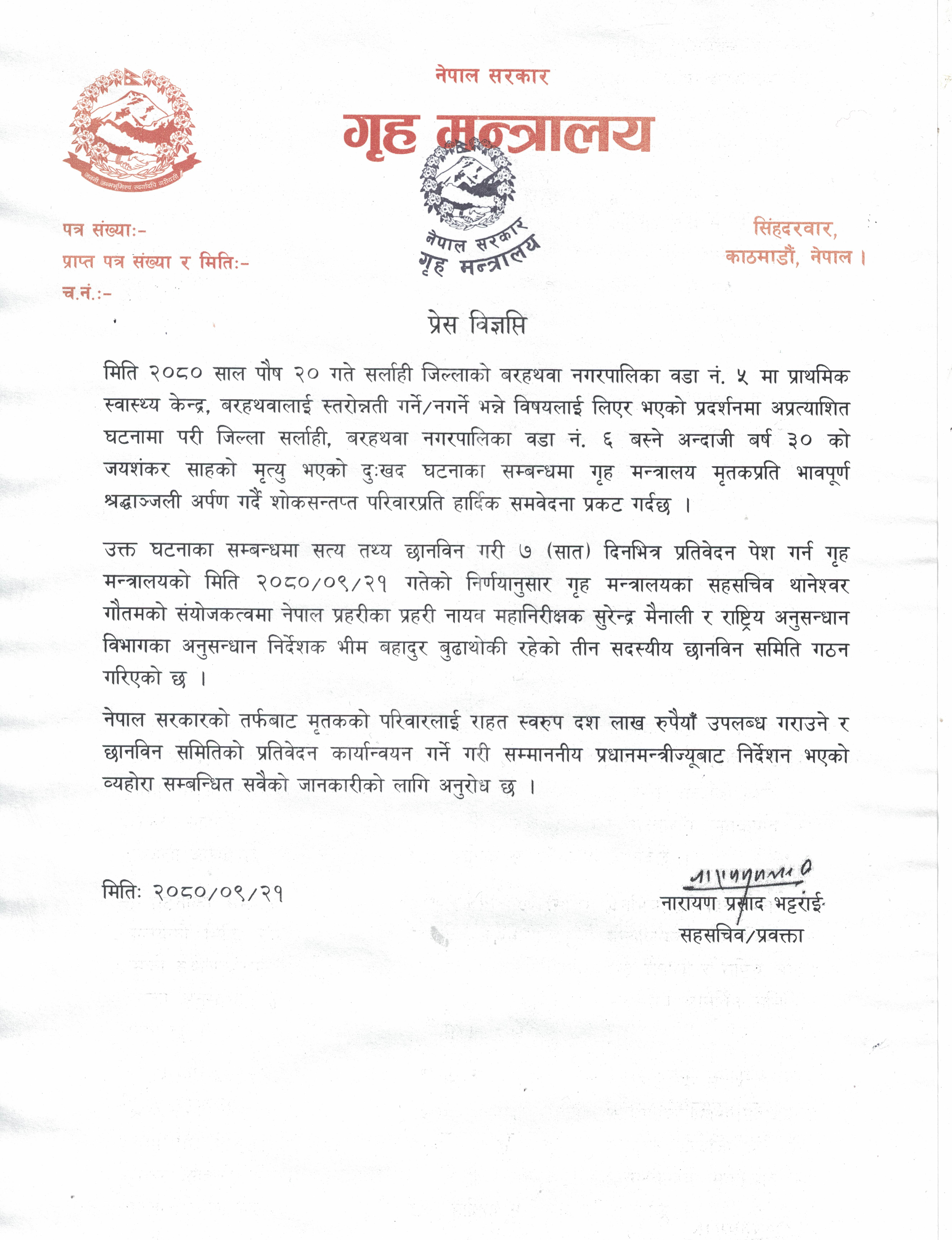 साथै सो घटनाबारे सत्य तथ्य छानबिन गरी ७ दिनभित्र प्रतिवेदन पेश गर्न गृह मन्त्रालयका सहसचिव थानेश्वर गौतमको संयोजकत्वमा तीन सदस्यीय छानबिन समिति समेत गठन गरिएको विज्ञप्तिमा उल्लेख छ । छानबिन समितिको सदस्यमा प्रहरी नायव महानिरीक्षक सुरेन्द्र मैनाली र राष्ट्रिय अनुसन्धान विभागका अनुसन्धान निर्देशक भीमबहादुर बुढाथोकी रहेका छन् ।