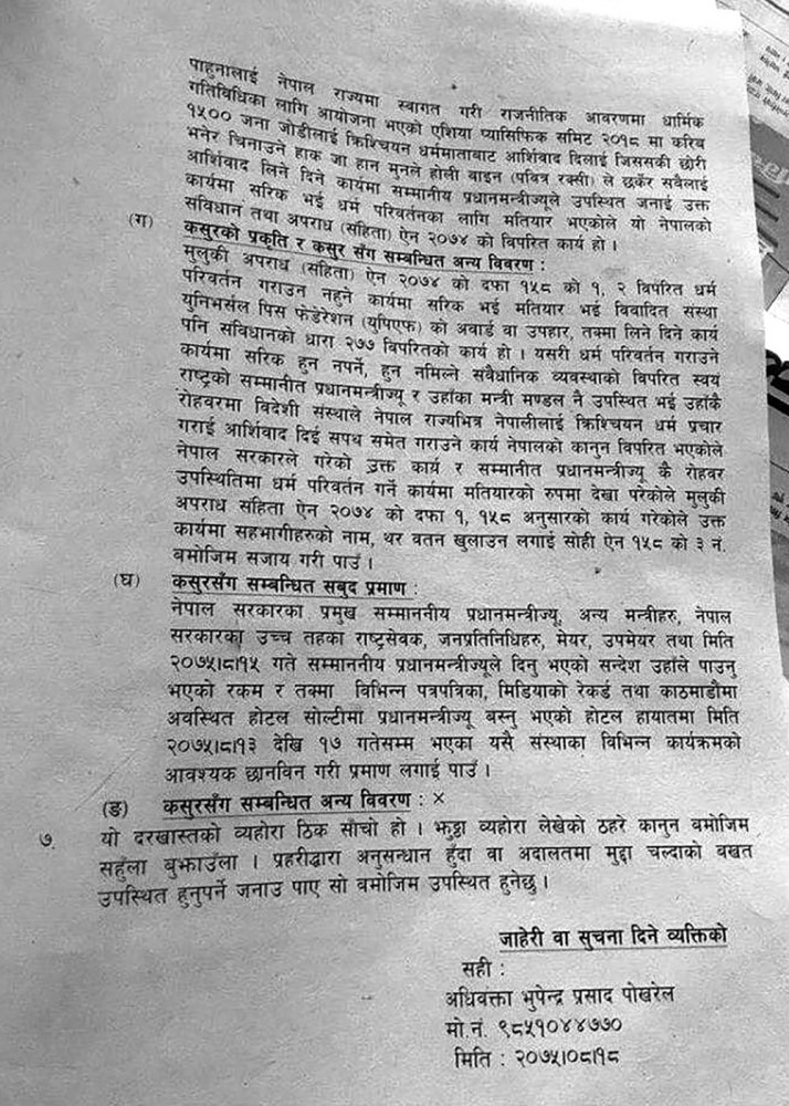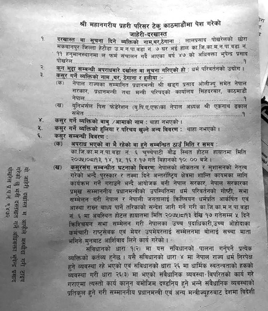 अधिवक्ता पोखरेल संविधानले कुनै पनि धर्म परिवर्तन गराउन नपाउने व्यवस्थाविपरीत प्रधानमन्त्रीले कार्य गरेको दावीसहित जाहेरी दर्खास्त दिन काठमाडौं प्रहरी परिसर, टेकु पुगेका थिए। तर, यस्तो जाहेरी लिई अनुसन्धान नहुने भन्दै फर्काएको उनले बताए।
