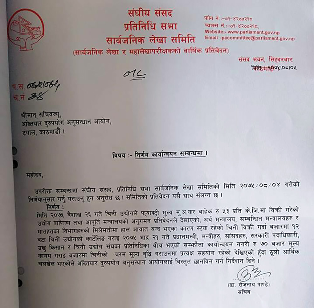 चिनी प्रकरणमा लेखा समितिले गरेकाे छानविन प्रतिवेदन: