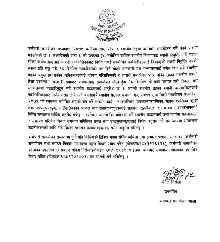 त्यस्तै, साबिकका स्थानीय निकायबाट स्थायी नियुक्ति पाई बहाल रहेका कर्मचारीलाई आफ्नो कार्यपालिकाबाट निर्णय गराई स्थायी नियुक्तिको सक्कल प्रति रुजु गरी १० दिनभित्र समायोजनको पत्र मन्त्रालयलाई उपलब्ध गराउनसमेत सबैै स्थानीय तहलाई परिपत्र गरिएको मन्त्रालयले जनाएको छ।