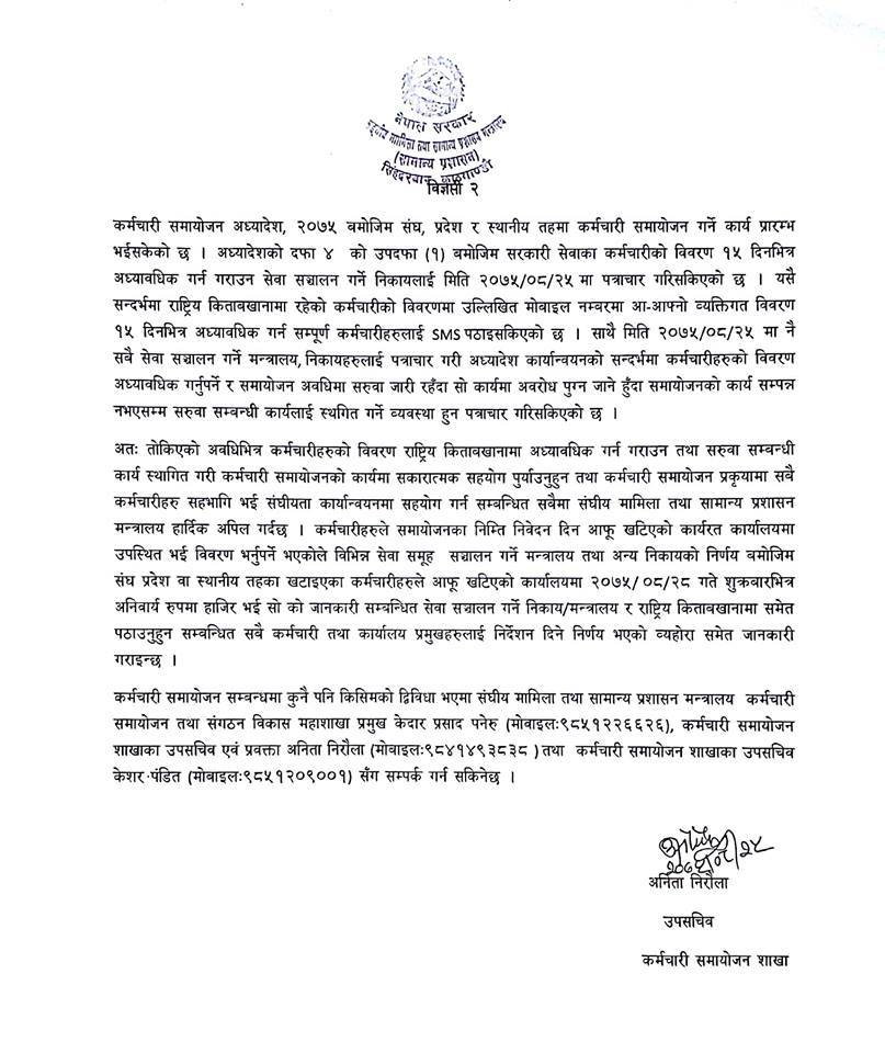 यसैगरी 'कर्मचारी समायोजन अध्यादेश, २०७५' बमोजिम संघ, प्रदेश र स्थानीय तहमा कर्मचारी समायोजन कार्य प्रारम्भ भइसकेको मन्त्रालयले जनाएको छ। समायोजन प्रक्रियामा सहभागी भई १५ दिनभित्र आफ्नो विवरण राष्ट्रिय किताबखानामा अद्यावधिक गर्न मन्त्रालयले सबै निजामति कर्मचारीलाई ‘एसएमएस’मार्फत जानकारी गराएको छ। ‘८८ हजार १ सय ६३ कर्मचारीलाई मन्त्रालयले यस्तो एसएमएस पठाएको छ,’ निरौलाले भनिन्।