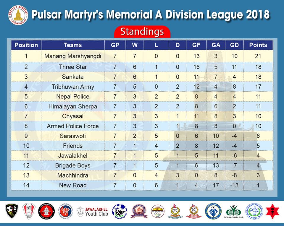 त्यसैगरी लिगमा अपराजित टोली त्रिभुवन आर्मी १७ अङ्क बनाउँदै चौथो स्थानमा छ। नेपाल पुलिस र हिमालन शेर्पाले समान ११ अङ्क जोड्दै क्रमशः पाँचौ र छैठौ स्थानमा रहेका छन्।