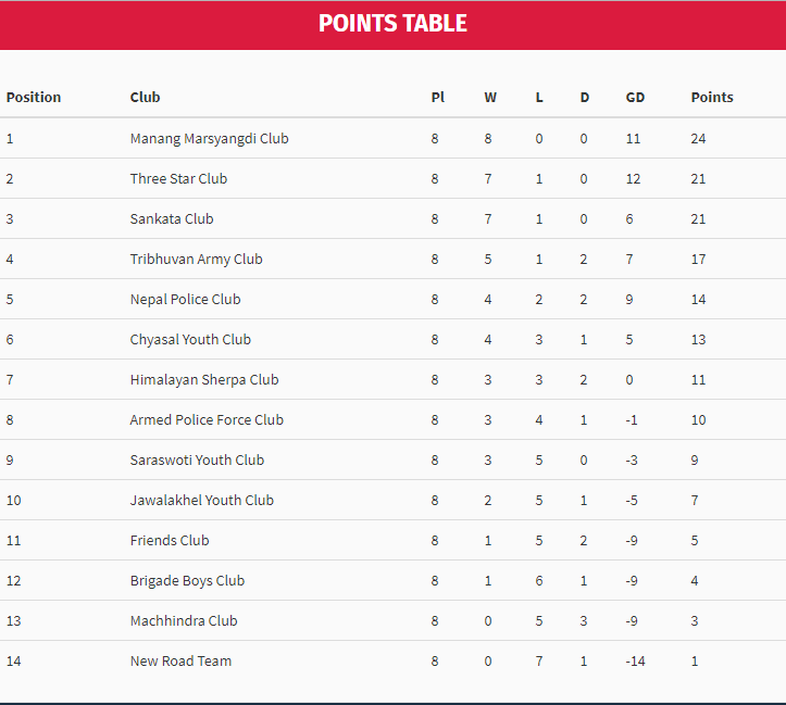 शनिबारका खेलसँगै लिगको आठौं चरणका खेल सकिएका छन्। लिगमा शीर्ष स्थानको मनाङ मस्याङ्दी क्लबको २४ अंक छ। दोस्रो स्थानको थ्रीस्टारको २१ अंक छ। तेस्रो स्थानको संकटाले पनि २१ अंक नै बटुलेको छ।