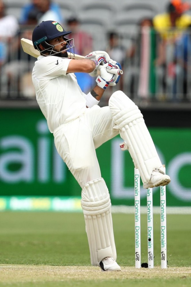 पर्थमा जीवनको ६३औं तथा टेस्टको २५औं शतक बनाउने क्रममा कोहलीले २ सय १४ बल खेलेर ११ चौका प्रहार गरेका थिए। उनी २ सय २७ बलमा १३ चौका र १ छक्का प्रहार गरेर १ सय २३ रन बनाएर खेलिरहेको अवस्थामा पाट कमिङको बलमा ह्यान्डकमबाट क्याच भएका थिए। कोहलीले शतक प्रहार गरेपनि पहिलो इनिङमा भारत २ सय ८३ रनमा आउट हुँदा ४३ रनले पछि पर्यो।