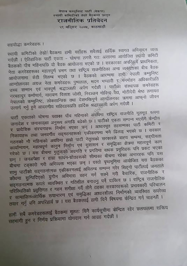 नेपाल कम्युनिस्ट पार्टीको स्थायी समिति बैठक गत मंसिर २९ शनिबार देखि जारी छ। शनिबार दुई घन्टा बसेर स्थगित भएको बैठक आाज (सोमबार) पनि बसिरहेको छ।