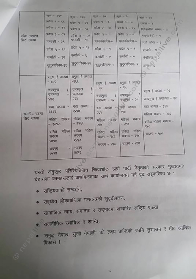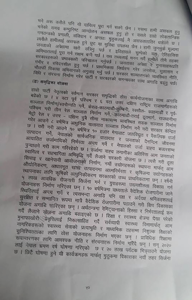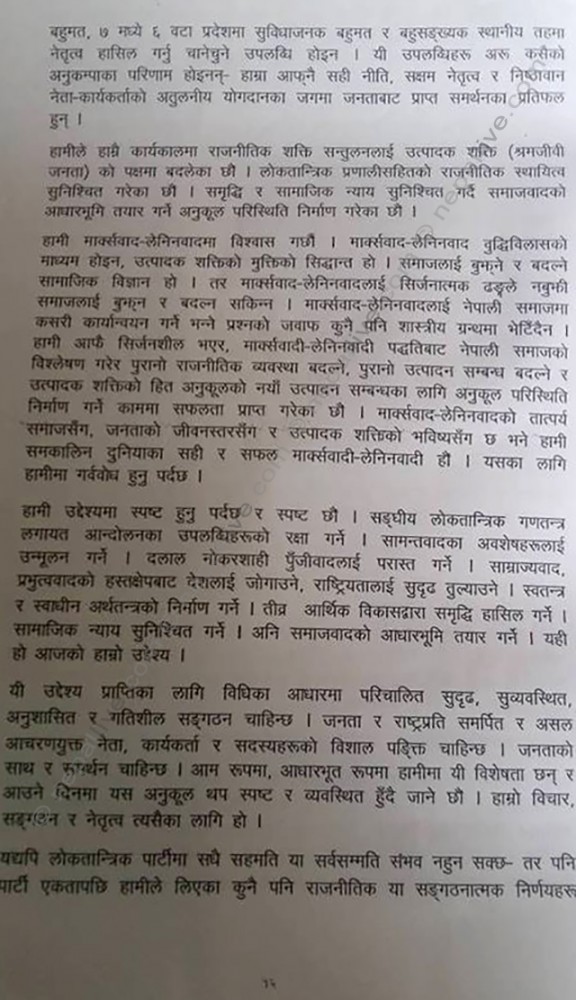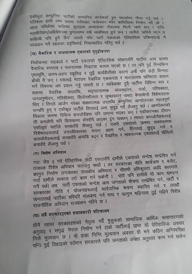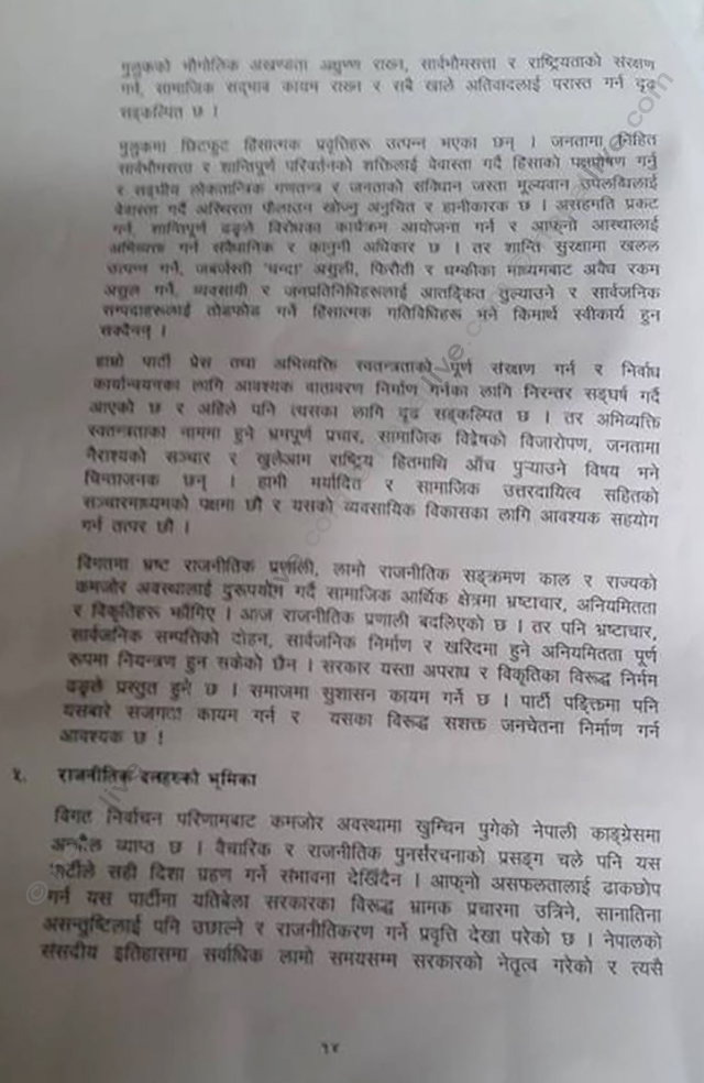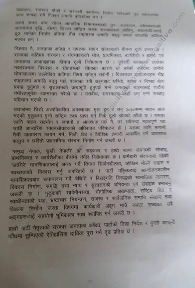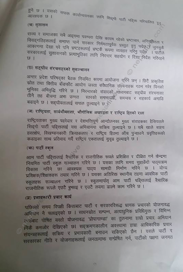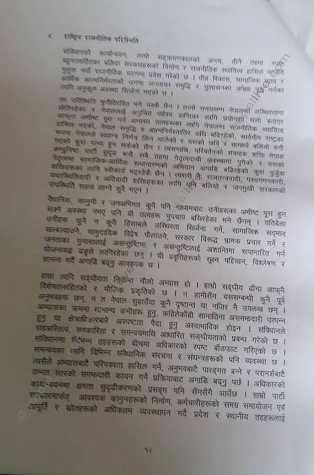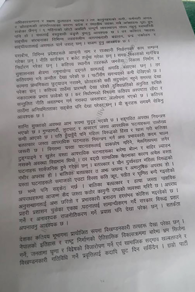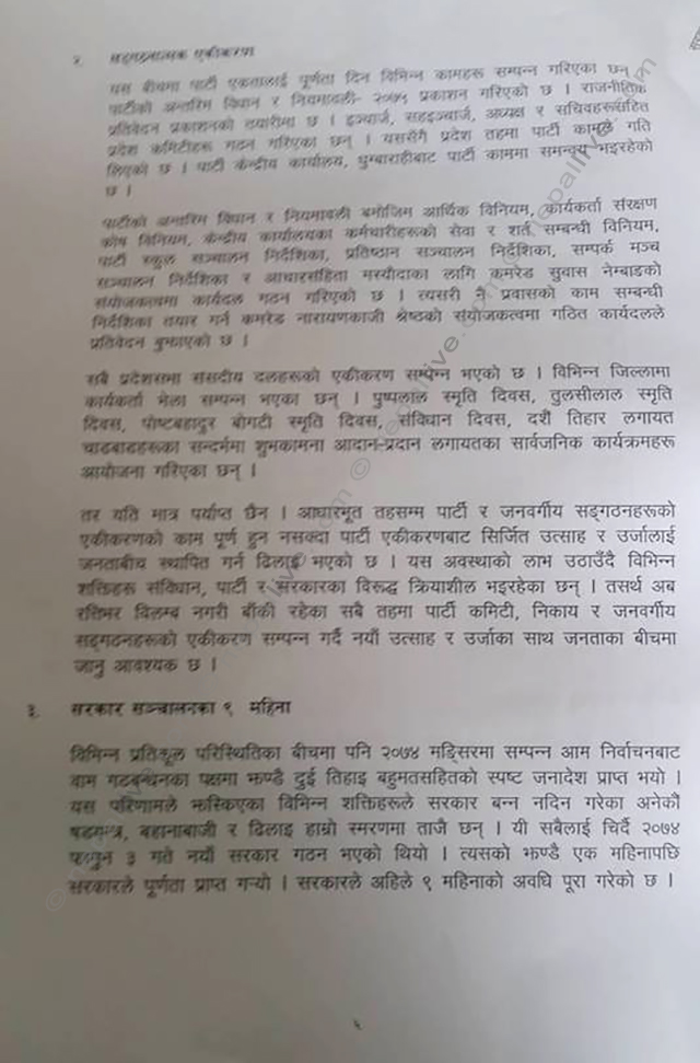 'पछिल्लो समय विपक्षी कित्ताबाट पार्टी र सरकारविरुद्ध भ्रामक प्रचारको योजनावद्ध अभियान नै चलाइएको छ। साधनस्रोत सम्पन्न, अत्याधुनिक प्रविधियुक्त र विभिन्न ठाउँबाट पोषित यस्तो योनजाबद्ध 'प्रोपागाण्डा'का तुलनामा हाम्रो प्रचार अभियान निकै कमजोर देखिएको छ', प्रतिवेदनमा भनिएको छ।