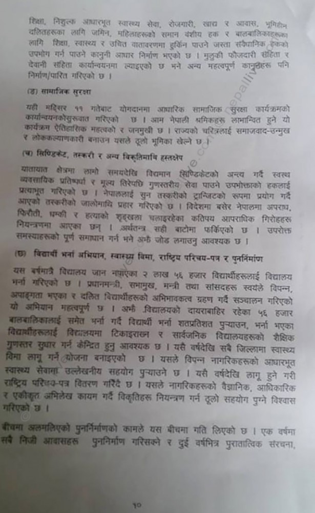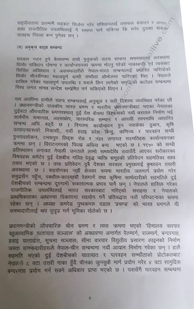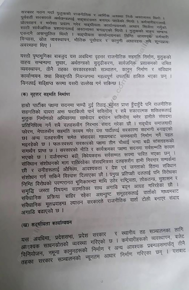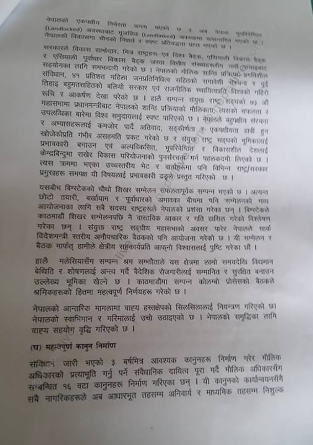 ९ महिनाको अवधिमा दलहरुबीच बृहत्तर सहमति निर्माण, संघीयता कार्यान्वयन, अनूकुल बाह्य सम्बन्ध, महत्त्वपूर्ण कानुन निर्माण तथा विद्यार्थी भर्ना अभियानजस्ता काम गरिएको प्रतिवेदनमा उल्लेख छ।