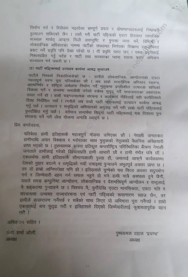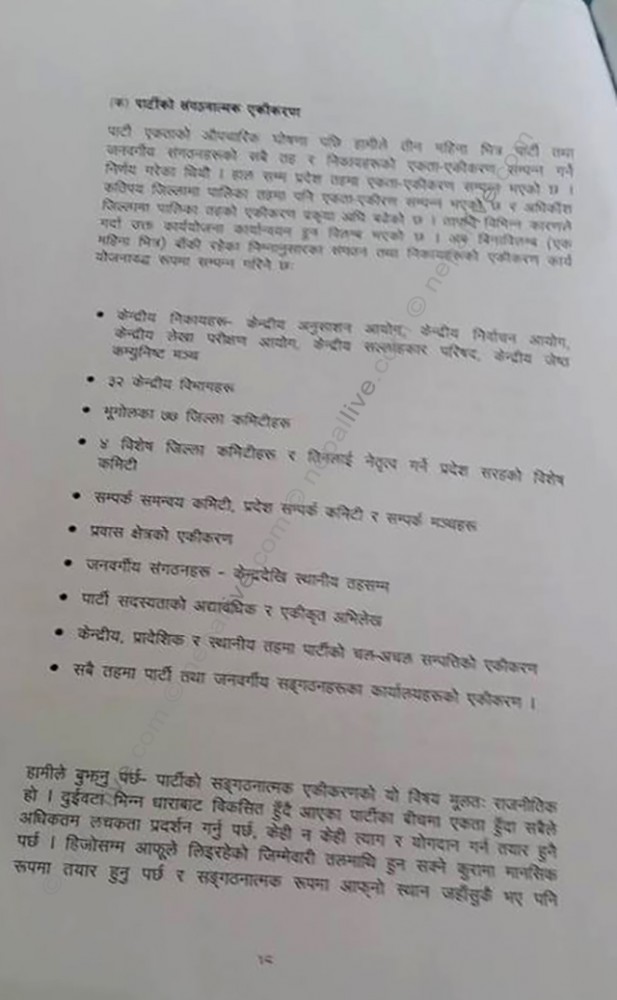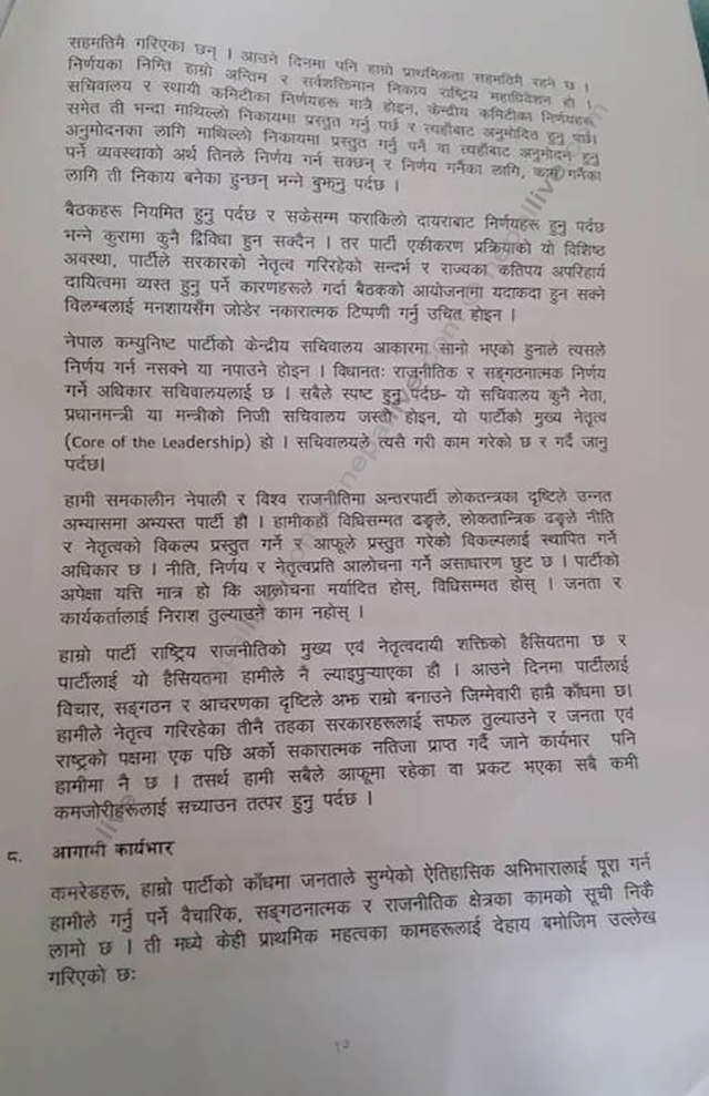 त्यस्तै पार्टीको आगामी कार्यभारअन्तर्गत पार्टीको सांगठनिक एकता, समृद्धिका योजना, सुशासन लगायतका बुँदाहरु राखिएका छन्। नेकपाले प्रचार कार्यलाई पनि प्राथमिकता दिएको छ।