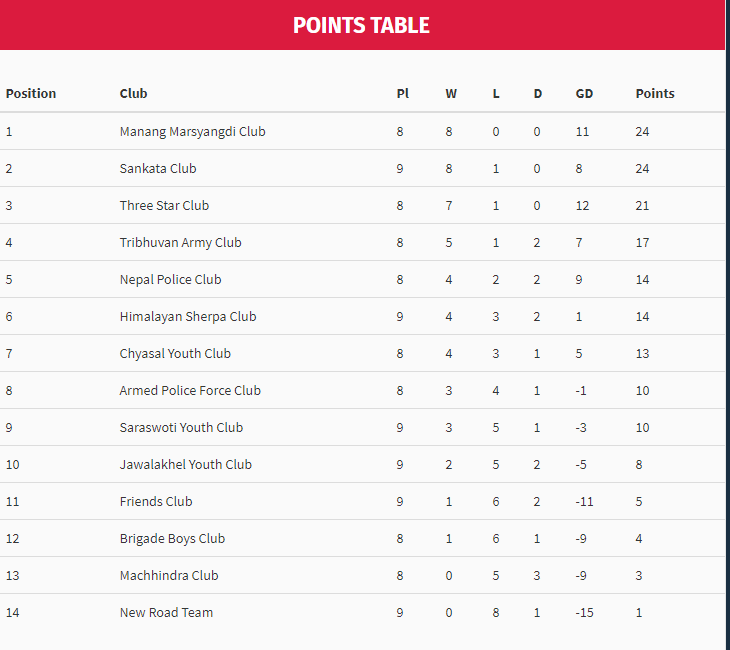 जितसँगै संकटाले ९ खेलबाट २४ अंक जोडेको छ। शीर्ष स्थानको मनाङ मर्स्याङ्दी क्लबको पनि २४ अंक नै छ। यद्पयपी मनाङले एक खेल कम खेलेको छ। तेस्रो स्थानको थ्रीस्टार क्लब ८ खेलबाट २१ अंक छ।