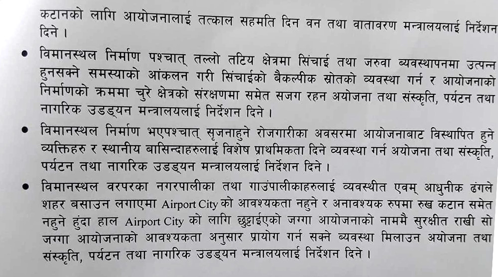 विमानस्थल निर्माणपछि तल्लो तटीय क्षेत्रमा सिंचाई तथा जरुवा व्यवस्थापनमा उत्पन्न हुनसक्ने समस्याको आंकलन गरी बैकल्पिक व्यवस्थापन गर्न समेत निर्देशन दिएको छ।