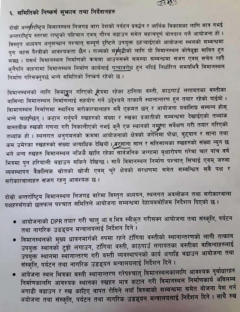 राष्ट्रिय सभा अन्तर्गतको समितिले स्थलगत अध्ययनपछि तयार पारेको प्रतिवेदनमा विमानस्थलका लागि आवश्यक पूर्वाधारहरु निर्माणका लागि आवश्यक स्थानका रुखहरु मात्र कटान गरी अबिलम्व अगाडि बढाउन भनेको छ।