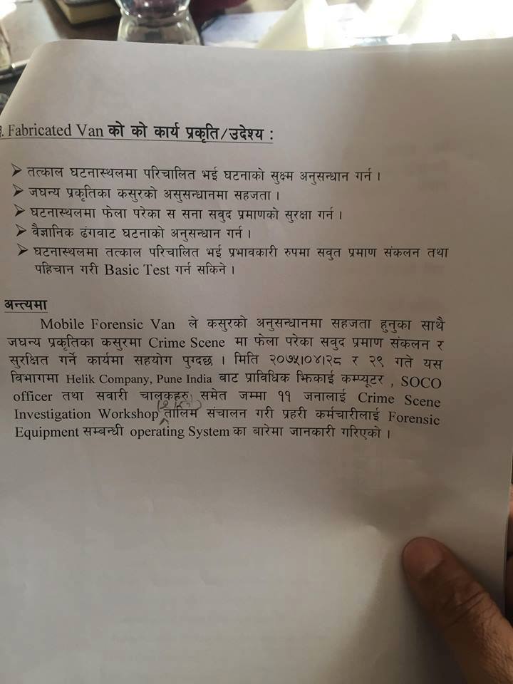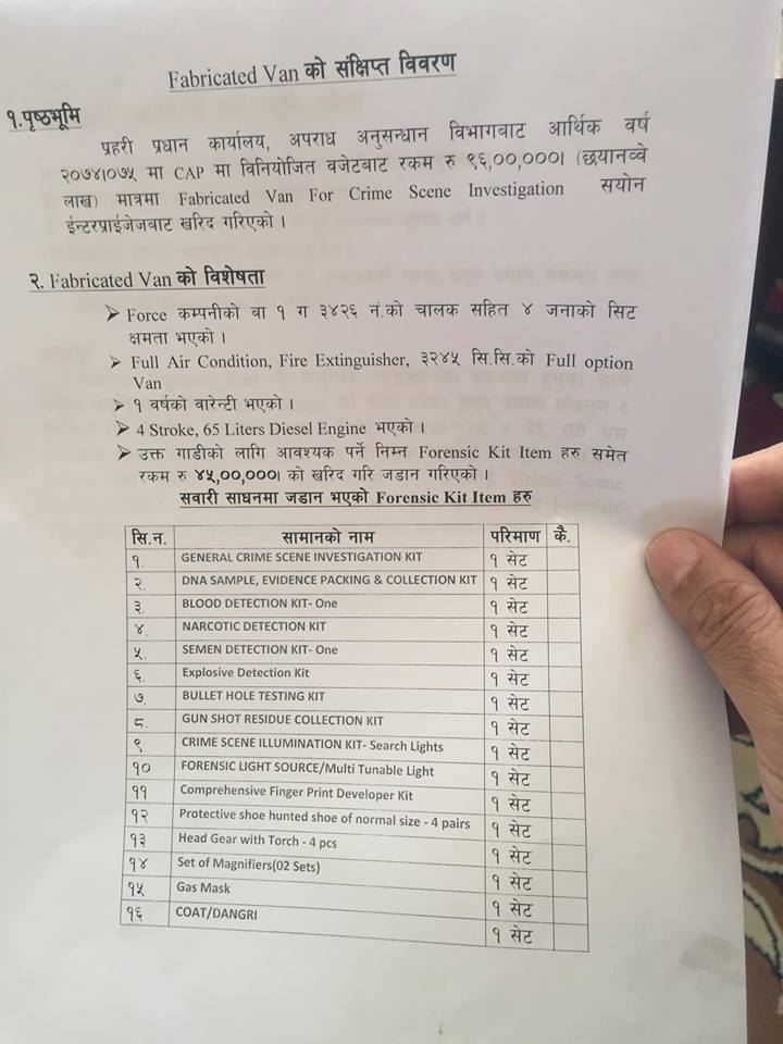 फोर्स कम्पनीको बा १ ग ३४२६ नम्बरको उक्त भ्यान ४ सिट क्षमताको छ। ४५ लाख बराबरका फरेन्सिक कीटका सामानहरु समते खरिद गरी उक्त गाडीमा जडान गरिएको छ।
