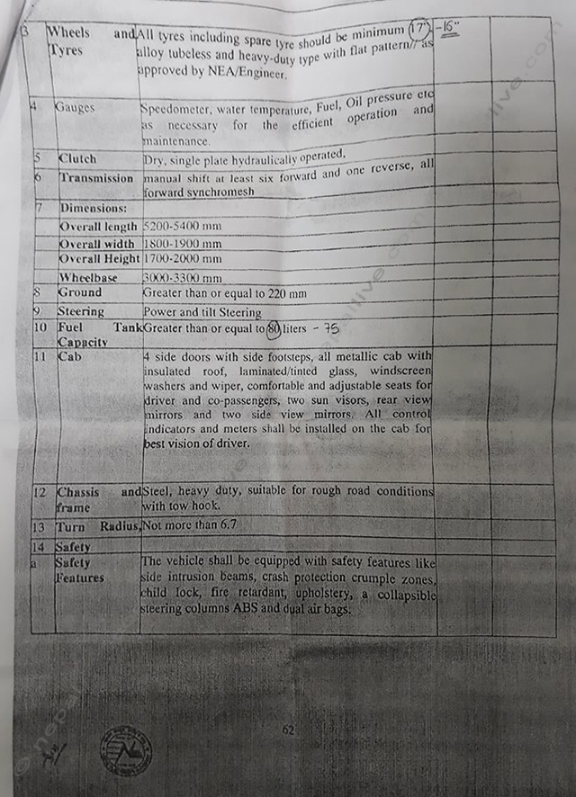 साथै ४ सिलिन्डरसहितको २४०० देखि २९०० सिसी क्षमताको पिकअपको पावर क्षमता १ सय ३० किलोवाट वा सोभन्दा बढी र टर्क क्षमता ४२० एनएम वा सोभन्दा बढी हुनुपर्ने सर्त राखेको छ। स्पेसिफिकेसनमा सबै स्पेयर टायर १६ इन्चको ट्युवलेस हुनुपर्ने सर्तसमेत अगाडि सारिएको छ।