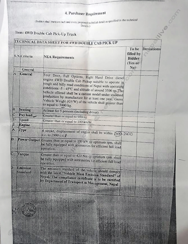 प्राधिकरणले गाडी खरिदका लागि ‘फोरडब्लुडी डबल क्याब पिकअप’ ट्रकको ‘स्पेसिफिकेसन’मा ४ वटा ढोका, फुल अप्सन, राइट ह्यान्ड ड्राइभ डिजल इन्जिन भएको फोरडब्लुडी डबल क्याब, शहरी तथा ग्रामिण शहरका सडकमा गुड्न सक्ने, माइनस ५ देखि माइनस ४५ डिग्री सेन्टिग्रेडसम्म र समूद्र सतहदेखि ३ हजार ५ सय मिटरको उचाइमा गुड्न सक्ने र पछिल्लो एक वर्षभित्र उत्पादन भएको हुनुपर्ने गाडीको औसत तौल ३ हजार किलोभन्दा बढी वा सोही बराबर भएको हुन पर्ने उल्लेख छ।