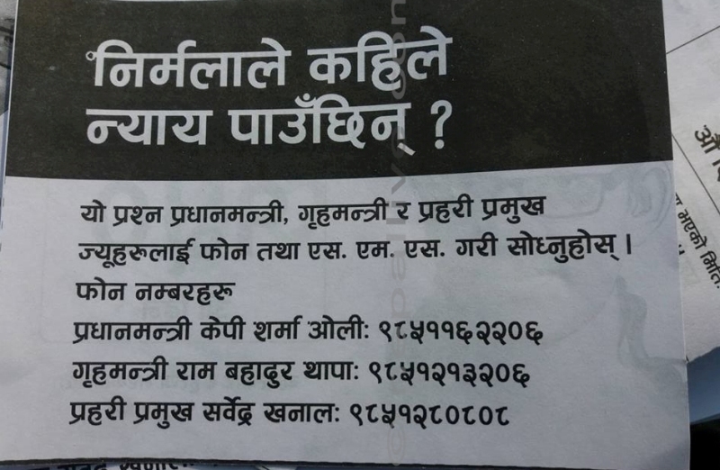 निर्मलाले कहिले न्याय पाउँछिन् भनेर सोध्नका लागि प्रधानमन्त्री, गृहमन्त्री र आइजिपीकाे माेबाइल नम्बर रहेको पर्चा सर्वसाधाणलाई वितरण गर्दै रचनात्मक दबाब दिएका छन्।