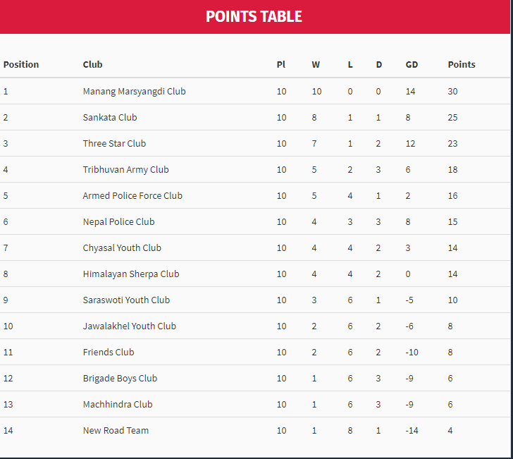 लिगको अंक तालिकामा मनाङले आफूलाई अब्बल साबित गर्ने क्रममा १० खेलमा १० नै खेल जित्दै ३० अंक जोडेको छ। दोस्रो स्थानको संकटाको २५ अंक छ भने २३ अंक जोडेको थ्रीस्टार तेस्रो स्थानमा छ। यता दशौं चरणमा सशस्त्र प्रहरी बलको एपिएफ क्लबसँग २–१ ले पराजित भएको आर्मी भने औपचारिक रुपमा उपाधि होडबाट बाहिरिएको छ।
