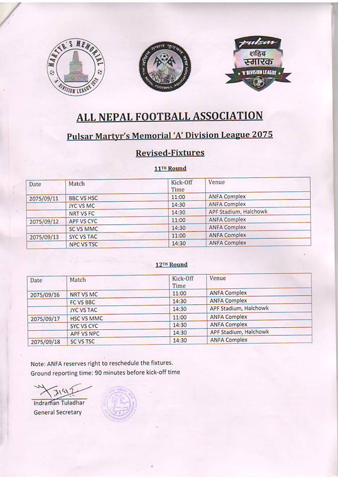 यता अखिल नेपाल फुटबल संघ (एन्फा)ले ११औं र १२औं चरणको खेल तालिका प्रकाशन गरेको छ। ११ औं चरणमा उपाधि होडमा रहेका संकटा र मनाङबीच पुस १२ गते खेल हुनेछ। यो खेलमा जित हात पारे मनाङ २ खेल अघि नै लिग च्याम्पियन हुनेछ। संकटा विजयी भएमा भने लिग उपाधिको होड रोमाञ्चक बन्नेछ। यद्पयी संकटाले १३ औं चरणमा थ्रीस्टारसँग खेल्नेछ। यो खेल संकटाका लागि कठिन हुने देखिन्छ।