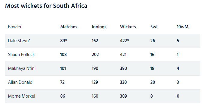 स्टेन विश्वका सर्वाधिक विकेट लिने खेलाडीमो उत्कृष्ट १० मा समेत पर्छन्।