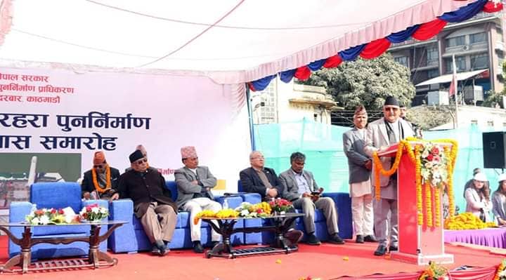 उनले धरहरा नेपाल र नेपालीको प्यारो सम्पदा भएको उल्लेख गर्दै यसको पुनर्निर्माण गर्ने संकल्प अघि बढाइएको पनि जानकारी दिए। अघिल्लो पटक प्रधानमन्त्री हुँदा ‘मेरो धरहरा, म आफैं बनाउछु’ भन्ने अभियान अघि बढ्न नसकेको स्विकार्दै उनले भने, 'अब भने तोकिएकै समयमा धरहरा बन्नेमा विश्वस्त छु।'