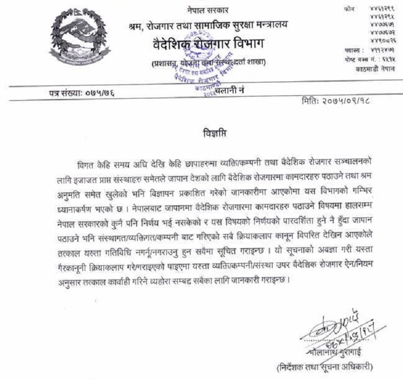 जापान रोजगारीमा पठाउने भन्दै राहदानी संकलन गर्ने व्यक्ति तथा संस्थामाथि कारबाही गर्ने विभागको सूचनामा उल्लेख गरेको छ।