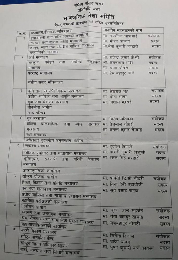 सर्वोच्च अदालत, भौतिक पूर्वाधार तथा यातायात मन्त्रालय, भूमिसुधार, सहकारी तथा गरिबी निवारण मन्त्रालय र उपराष्ट्रपतिको कार्यालयको बेरुजु हृदयस त्रिपाठी संयोजक रहेको पार्वती कुमारी विशुन्के र शरतसिंह भण्डारी सदस्य रहेको उपसमितिले हेर्नेछ।