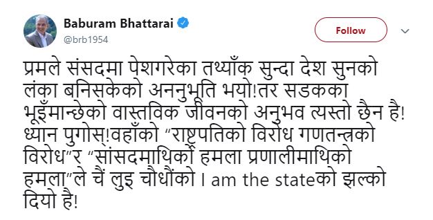 आइतबार साँझ भट्टराईले ट्विट गर्दै प्रधानमन्त्री ओलीले संसदमा पेस गरेका तथ्यांक सुन्दा 'देश सुनको लंका बनिसकेको अनुभूति भयो' भन्दै व्यंग्य प्रहार समेत गरेका छन्।