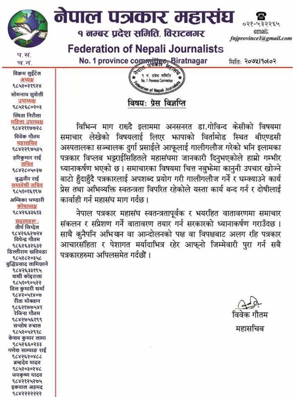 विराटनगर– इलाममा अनसनरत डा. गोविन्द केसीको पक्षमा समाचार लेखेको भन्दै बिएन्डसी अस्पतालका सञ्चालक दुर्गा प्रसाईंले पत्रकारहरूलाई गाली गलौज गरेकोप्रति नेपाल पत्रकार महासंघ प्रदेश–१ले आपत्ति जनाएको छ।