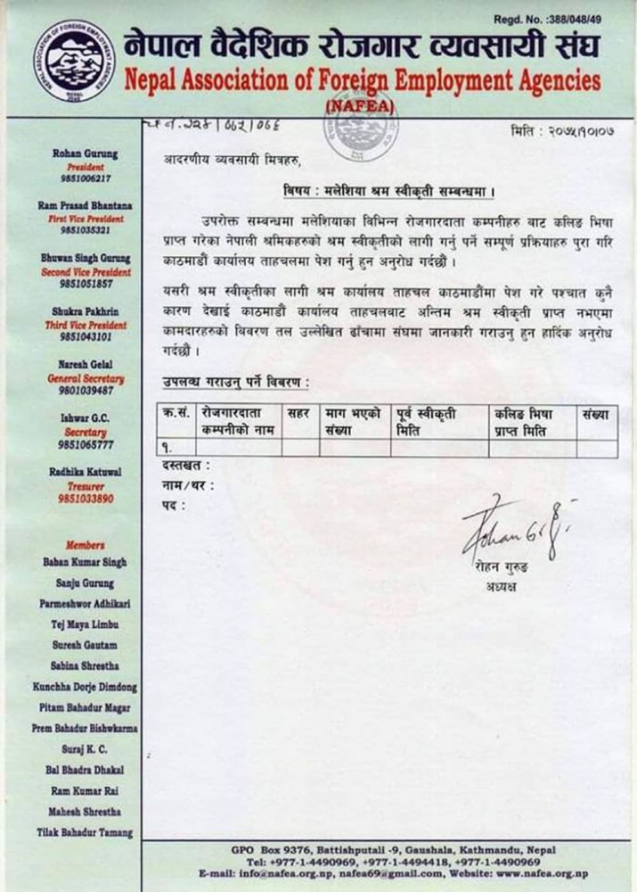 विभागले मलेसिया जाने प्रक्रियामा रहेका जेठ २ गते अगाडि नै कलिङ भिसा आएका कामदारको विवरण माग गरेसँगै वैदेशिक रोजगार व्यवसायी संघले पनि म्यानपावर व्यवसायीसँग विवरण संकलन गर्ने भएको छ।