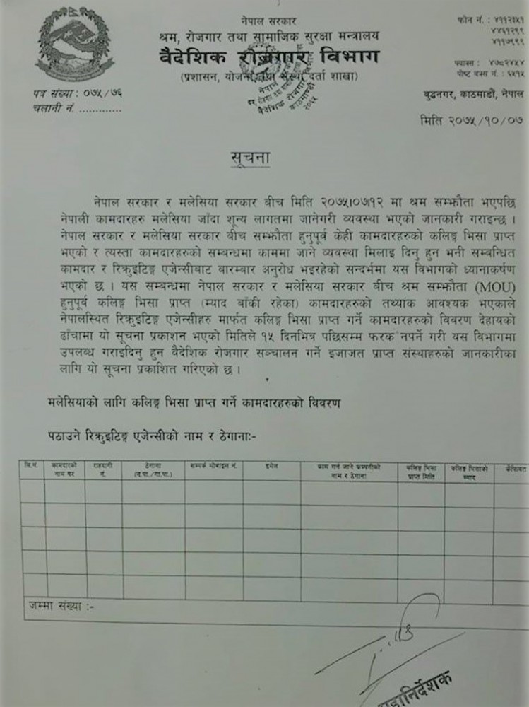 वैदेशिक रोजगार विभागले माघ ७ गते सोमबार एक सूचना प्रकाशित गर्दै १५ दिनभित्र कलिङ भिसा प्राप्त गरेर मलेसिया जानबाट वञ्चित कामदारको विवरण मागेको हो।