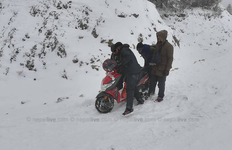 हिमपातसँगै वर्षा पनि भएकोले सडकमा सवारीसाधनहरु बिग्रिएका पनि देखिन्थे। कतिपय हिउँमा फसेका मोटरसाइकलहरु धकेल्नमा व्यस्त थिए। पार्किङ गरिएका सवारी साधनमा हिउँले नै सुरक्षा दिइरहेको जस्तो लाग्थ्यो। सवारी साधनका नत प्रष्टसँग नम्बर प्लेट देखिन्थ्यो, नत ब्रान्ड नै।