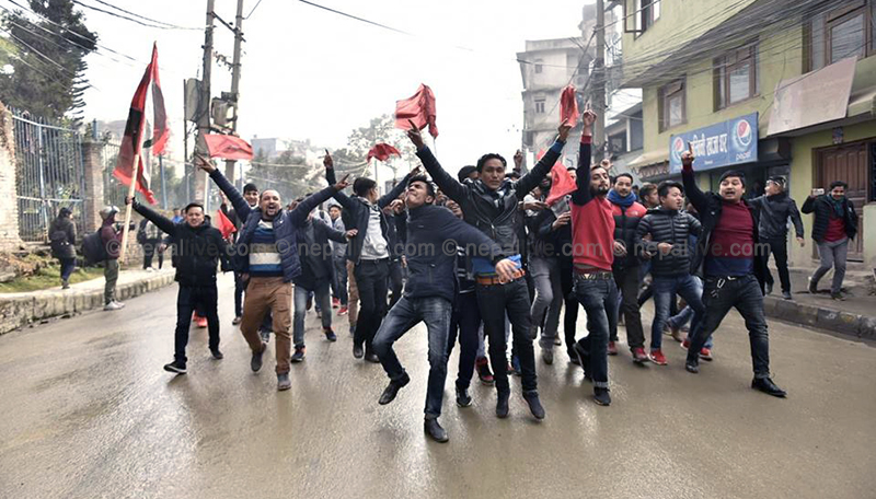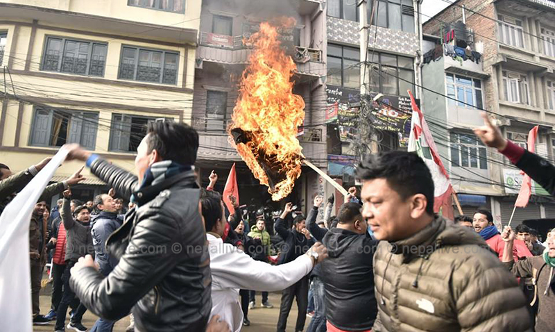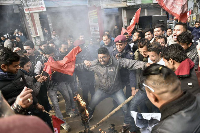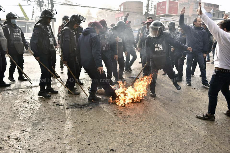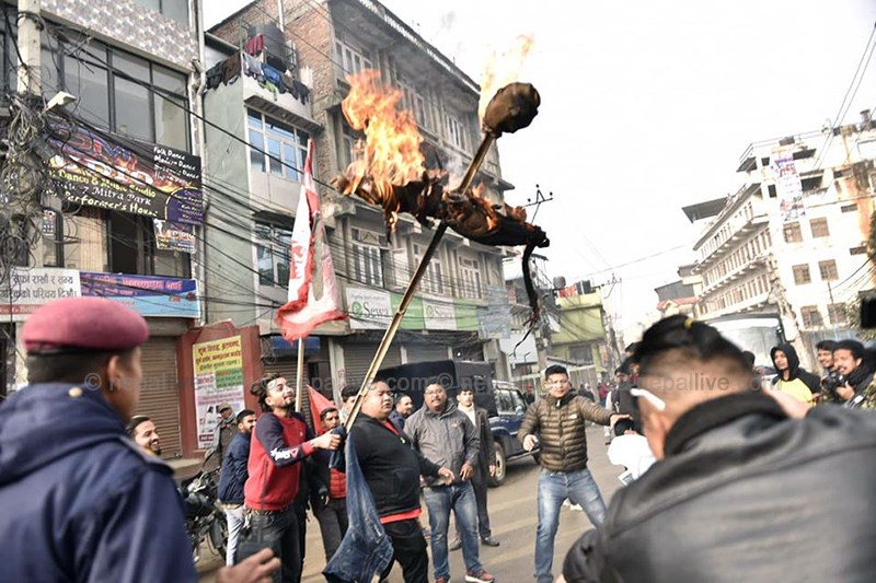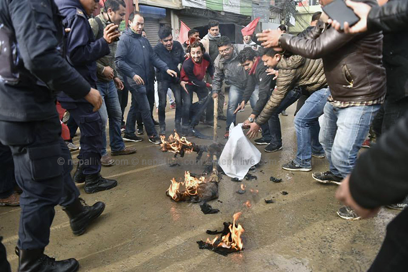 यसअघि आइतबार बिहान नेविसंघले उपत्यकाका विभिन्न्न क्याम्पस अघि विरोध प्रदर्शन गरेको छ। आन्दोलनरत विद्यार्थीहरुले प्रधानमन्त्री केपी शर्मा ओलीकाे पुत्लासमेत दहन गरे।