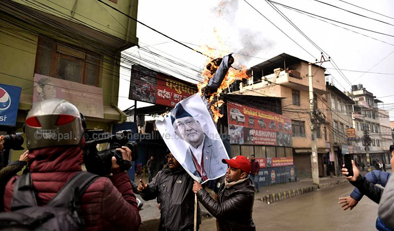 वरिष्ठ चिकित्सक गोविन्द केसीको माग विपरित ‘राष्ट्रिय चिकित्सा शिक्षा विधेयक’ सरकारले प्रतिनिधिसभाबाट पारित गरेपछि झनै आक्रोशित भएको नेपाल विद्यार्थी संघले त्यसको विरोधमा आइतबार बिहान काठमाडौंको चावहिलस्थित पशुपति बहुमुखी क्याम्पस अगाडि सरकारविरुद्ध चर्का नाराबाजी लगाउँदै प्रधानमन्त्री ओलीको पुत्ला दहन गरेको हाे।