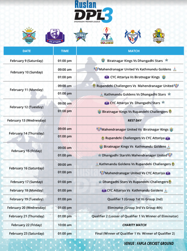 सार्वजनिक खेल तालिका अनुसार प्रतियोगिताको उद्घाटन खेलमा माघ २६ मा करण केसी रणनीतिक खेलाडी रहेको विराटनगर किंग्स र सोमपाल कामीको धनगढी स्टार्स भिड्ने छन्।