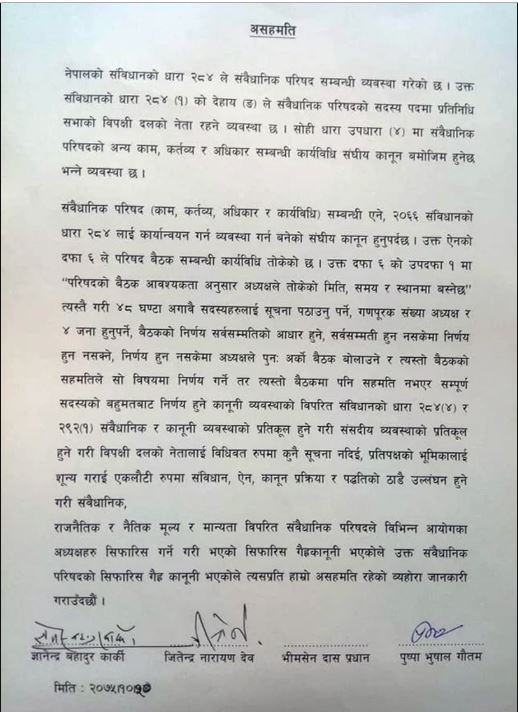 यस्ताे छ कांग्रेसको लिखित असहमति: