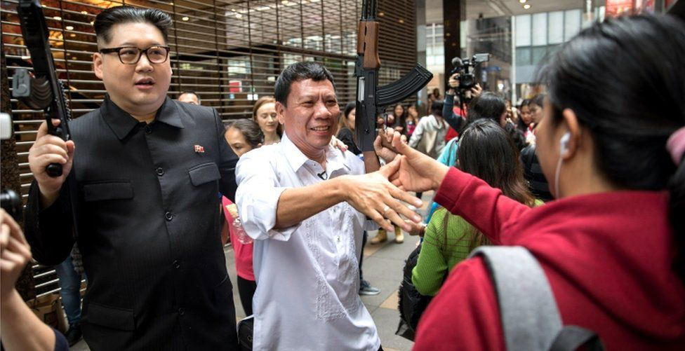 किम र दुतेर्तेजस्तै देखिने कलाकारले सोमबार हङकङको एक रेस्टुरेन्टमा सँगै खाना खाएको अभिनय प्रस्तुत गरेका थिए। दुई नेताले रेस्टुरेन्ट शयर गरेका दृश्य हेर्नेको भीड लागेको थियाे। साे क्रममा उनीहरुले हाेटलमा उपस्थित सेवाग्राहीसँग फाेटाे खिचाउनुका साथै हातसमेत मिलाएका थिए।