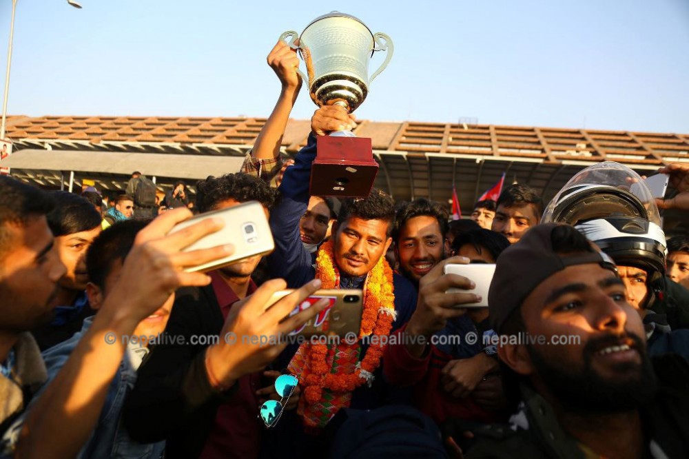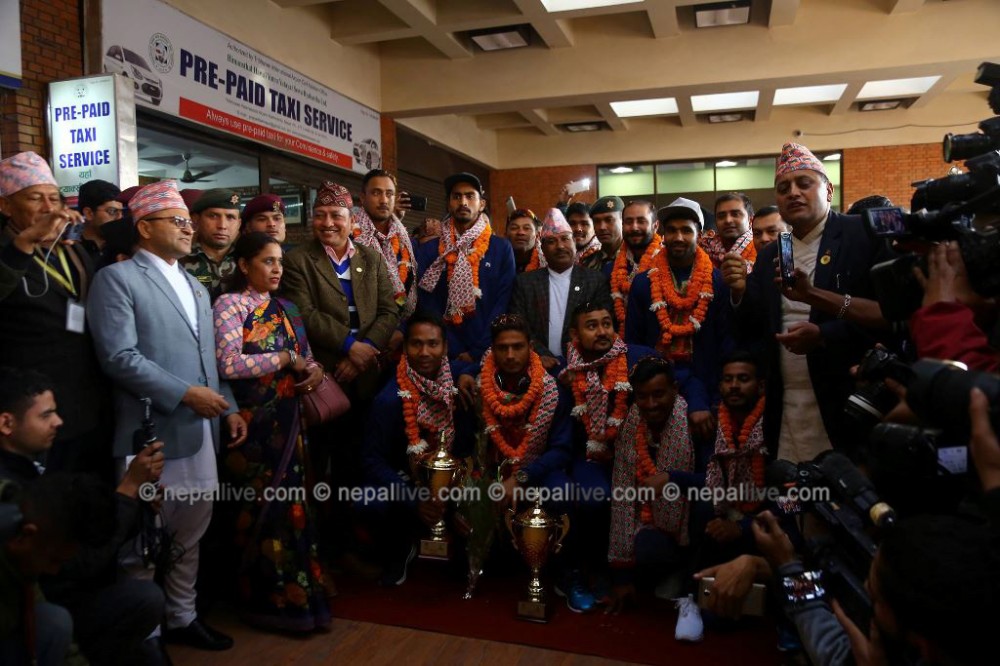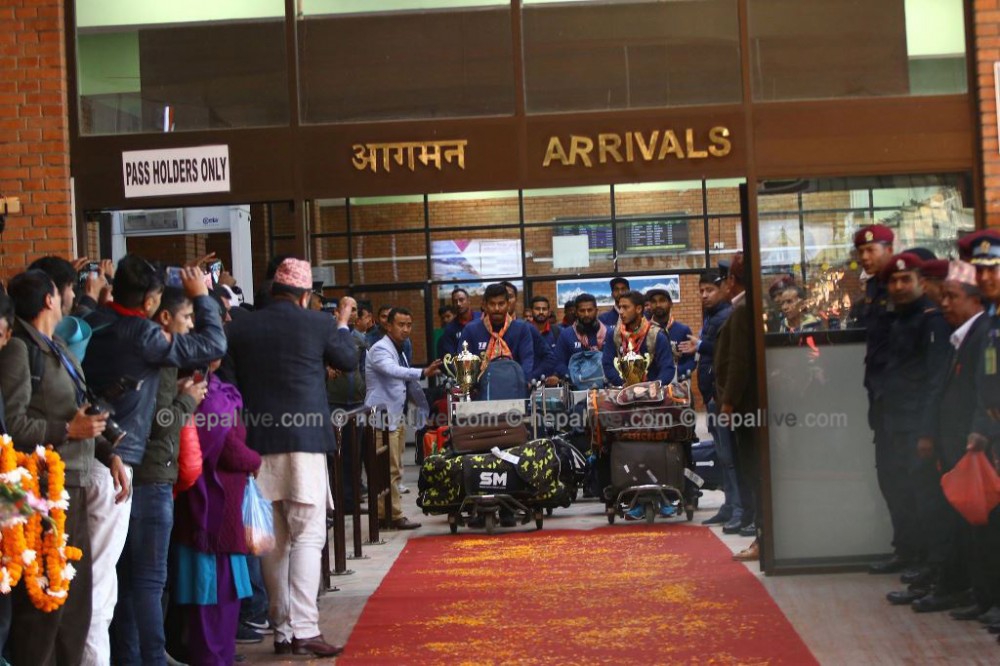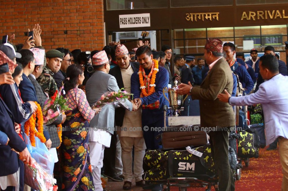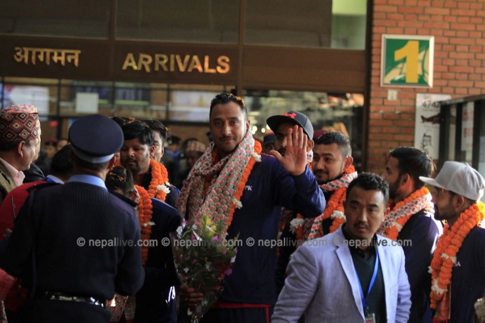 दुई वटा ऐतिहासिक सिरिज विजेता नेपाली टिम अपराह्न ४ बजे नेपाल आइपुगेको थियो। त्रिभुवन अन्तर्राष्ट्रिय विमानस्थलमा ओर्ले लगत्तै नेपाली टिमलाई भव्य स्वागतको गरिएको थियो। राष्ट्रिय खेलकुद परिषदले क्रिकेटलाई रेड कार्पेट बिछ्याएर स्वागत गरेको थियो। राष्ट्रिय क्रिकेटरलाई रेड कार्पेटमा बिछ्याएर स्वागत गरिएको यो पहिलो पटक हो।