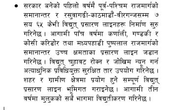 सरकार बनेको पहिलो वर्षमै पूर्व–पश्चिम राजमार्गको समानान्तर हुने गरी र रसुवागढी-काठमाडौं-वीरगञ्ज ७६५ केभी विद्युत प्रसारणलाइन निर्माण सुरु गरिनेछ।