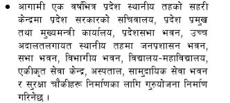 एक वर्षभित्र प्रदेश र स्थानीय तहका सहरी केन्द्रमा प्रदेश सरकारको सचिवालय, प्रदेश प्रमुख तथा मुख्यमन्त्री कार्यलय, प्रदेश सभा भवन, उच्च अदालतलगायत स्थानीय तहमा जनप्रशासन भवन, सभा भवन, विभागीय भवन, विद्यालय-महाविद्यालय, एकीकृत सेवा केन्द्र, अस्पताल, सामुदायिक सेवा भवन र सुरक्षा चौकीहरु निर्माणका लागि गुरुयोजना निर्माण गरिनेछ।