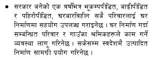 सरकार बनेको एक वर्षभित्र भूकम्पपीडित, बाढीपीडित, पहिरोपीडित, घरबारविहीन सबै परिवारलाई घर निर्माणमा सहयोग गरिनेछ।