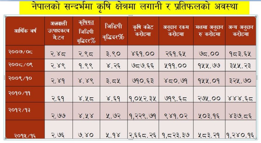 तर, सोही अवधिमा कृषिक्षेत्रको विकासमा भने प्रगति त टाढाको कुरा, कुल ग्रार्हस्थ्य उत्पादनमा कृषिक्षेत्रको योगदान घट्दै गएको देखिन्छ। विभिन्न अनुदान कार्यक्रम, बाली उत्पादकत्व तथा ग्रार्हस्थ उत्पादनको तथ्याङ्क तुलना गर्दा त्यस्ता कार्यक्रमले वास्तविक कृषिक्षेत्रमा कुनै पनि प्रभाव पार्न नसकेको स्पष्ट छ।
