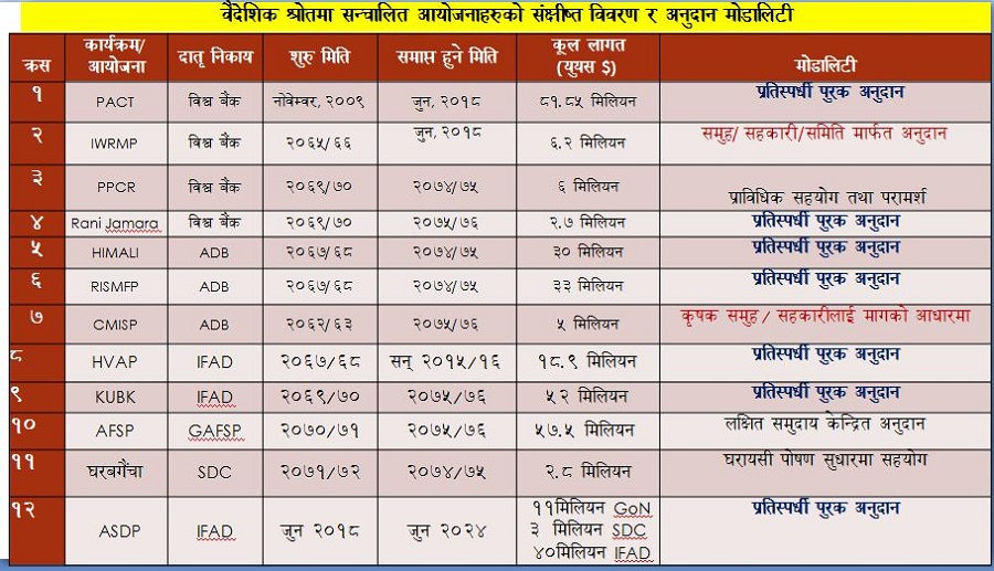 सन् २००९ देखि २०१९ सम्मको अवधिमा नेपालमा कुल ३४ करोड अमेरिकी डलर अर्थात् करिब ४० अर्ब रुपैयाँ वैदेशिक अनुदानका रूपमा कृषिक्षेत्रमा वितरण भएको मन्त्रालयको तथ्याङ्क छ। यो रकम व्यवस्थापन गर्नबाहेक सरकारको कुनै पनि खर्च छैन।