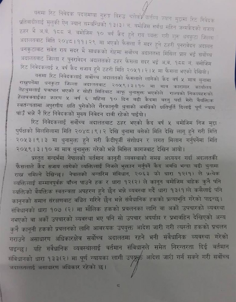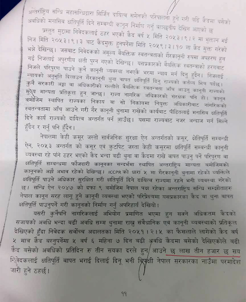 बढी जेल समयको क्षतिपूर्ति भराउन सर्वोच्चले प्रधानमन्त्री कार्यालय, गृह मन्त्रालय र कारागार व्यवस्थापन विभागका नाममा परमादेश जारी गरेको थियो।