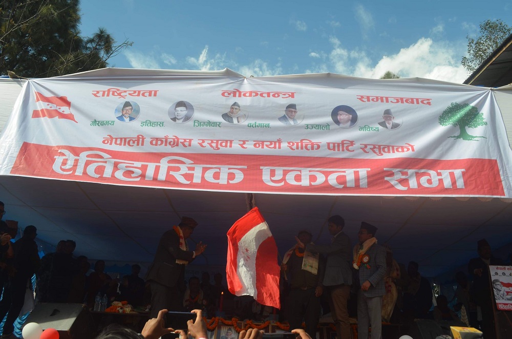 सोमबार कालिकास्थानमा आयोजना गरिएको कार्यक्रममा नयाँ शक्ति पाटी रसुवाका वार्ता समिति संयोजक फुर्पू वाङदी तामाङले नेपाली काग्रेसका जिल्ला सभापति पेम्वा छिरिङ तामाङलाई नयाँ शक्तिको झण्डा दिएर पार्टी एकताको घोषणा गरे। तामाङले झण्डा दिएर एकताको घोषणा गरेपनि कतिजना कांग्रसमा प्रवेश गरे भन्ने एकिन नभएको बताए।