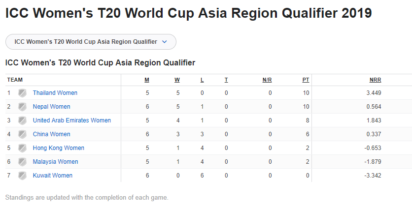जितसँगै नेपाल ६ खेलबाट १० अंक जोड्दै अंक तालिकाको दोस्रो स्थानमा उक्लिएको छ। शीर्ष स्थानको आयोजक थाइल्यान्डको ५ खेलबाट १० अंक छ। प्रतियोगिताको अन्तिम खेलमा थाइल्यान्ड र युएईबीच केहिबेरमा प्रतिस्पर्धा हुनेछ। खेलपछि आइसिसी विश्वकप छनोटमा छानिने शीर्ष एक टिमको टुंगो लाग्नेछ।