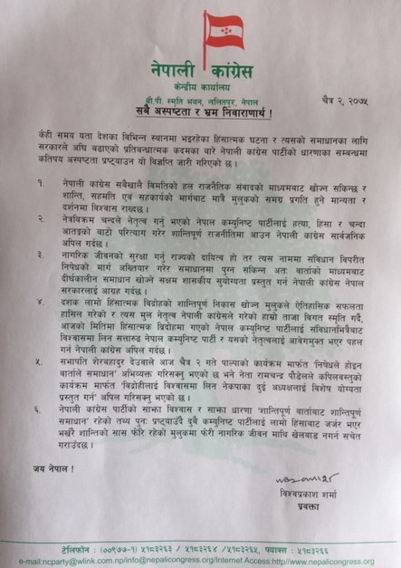 'दशक लामो हिंसात्मक विद्रोहको शान्तिपूर्ण निकास खोज्न मुलुकले ऐतिहासिक सफलता हासिल गरेको र त्यस मुल नेतृत्व नेपाली कांग्रेसले गरेको हाम्रो ताजा विगत स्मृति गर्दै, आजको मितिमा हिंसात्मक व्रिदोहमा गएको नेपाल कम्युनिष्ट पार्टीलाई संविधानभित्रैबाट विश्वासमा लिन सत्तारुढ नेपाल कम्युनिष्ट पार्टी र यसको नेतृत्वलाई आवेगमुक्त भएर पहल गर्न नेपाली कांग्रेस अपिल गर्दछ', विज्ञप्तिमा भनिएको छ।