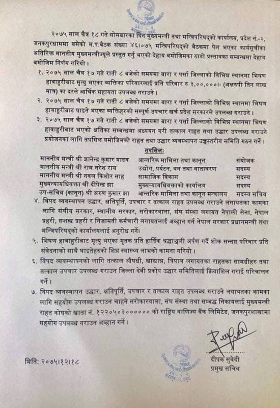 बैठकले बारा र पर्सामा आएको हावाहुरीका कारण ज्यान गुमाउने प्रति परिवारलाई तत्काल ३ लाख राहत प्रदन गर्ने निर्णय गरेको छ। राहत वितरण तथा उद्धारका लागि प्रदेश सरकारले ५ सदस्यीय कमिटी गठन पनि गरेको छ।