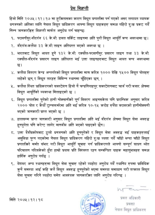 प्राधिकरणले आज एक विज्ञप्ति जारी गर्दै विद्युत क्षेत्रमा मात्र १० देखि १५ करोड रुपैयाँको हाराहारीमा क्षति भएको प्रारम्भिक आंकलन गरेको छ।